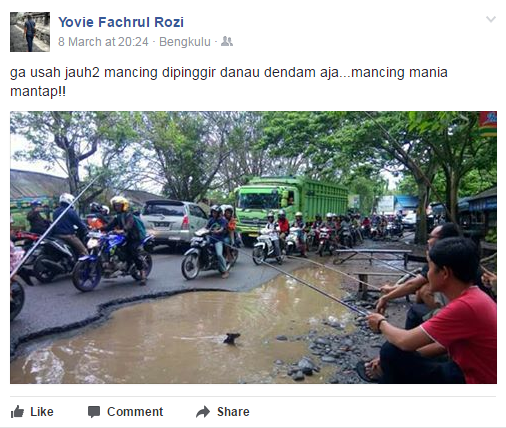 Sebagian besar warga Bengkulu juga sudah mengeluhkan jeleknya infrastruktur jalan terutama di Kota Bengkulu. Beberapa warga juga ada yang sampai melakukan aksi memancing di jalan yang berlubang dan tergenang air. Masyarakat kota Bengkulu juga banyak yang mengeluhkan jeleknya jalan yang ada di Kota Bengkulu dengan menggunggah beberapa foto jalan yang rusak dan juga membuat status tentang Jalan Buruk Bengkulu. Salah satunya seperti gambar yang ada di bawah ini