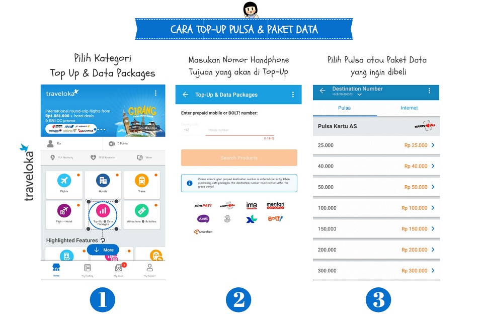 Pada awalnya saya juga bingung gimana caranya mau beli pulsa dan beli paket data, apalagi anak-anak juga nggak bisa ditinggal apalagi dibawa karena cuaca hujan dan badai, untung saja sebelumnya saya pernah mendownload sebuah aplikasi online yang menyediakan layanan penjualan tiket pesawat, hotel, kereta api yang juga menyediakan layanan Top Up Pulsa dan Data Paket Internet, nama aplikasinya adalah Traveloka. Nggak perlu mikir lama lagi, saya langsung membeli pulsa dan paket data menggunakan aplikasi Traveloka sebelum paket internet benar-benar habis.